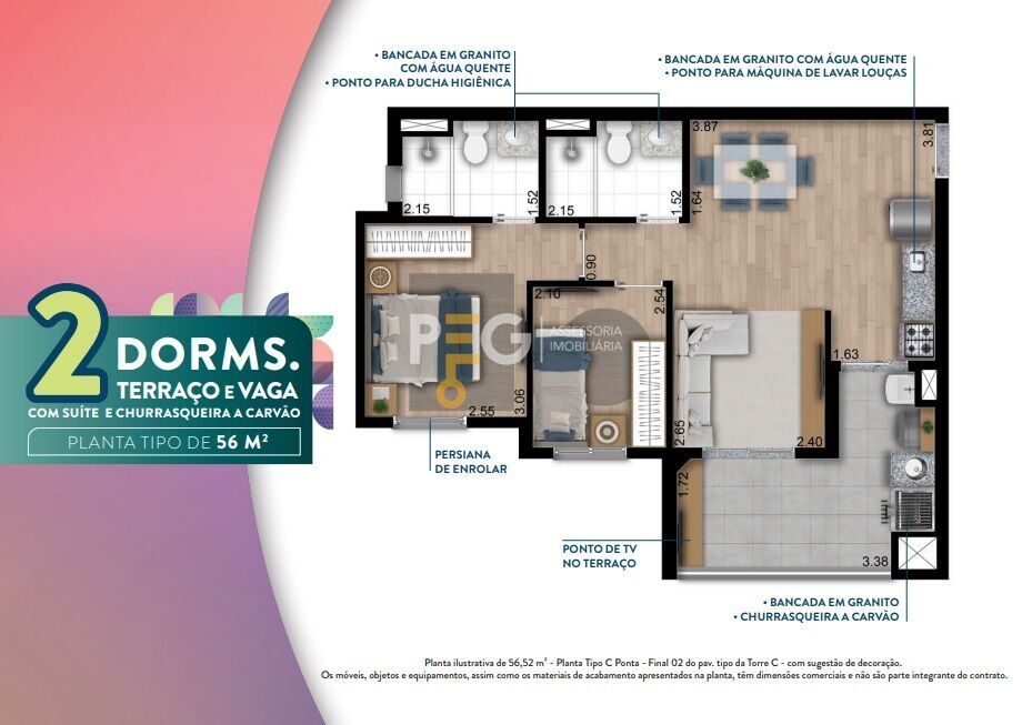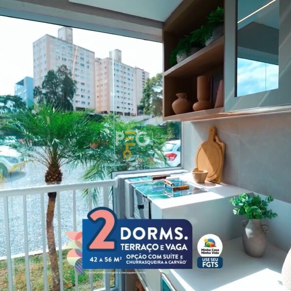 56 m² - 2 Dormitórios sendo 1 suíte, terraço com churrasqueira a carvão e vaga de garagem.