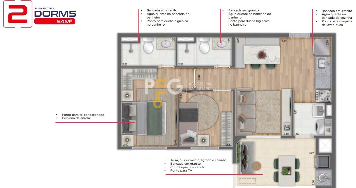 2 DORMS C/ SUÍTE E TERRAÇO (OPÇÃO DE SALA AMPLIADA) = 54M², 57M², 59M² e 60M²